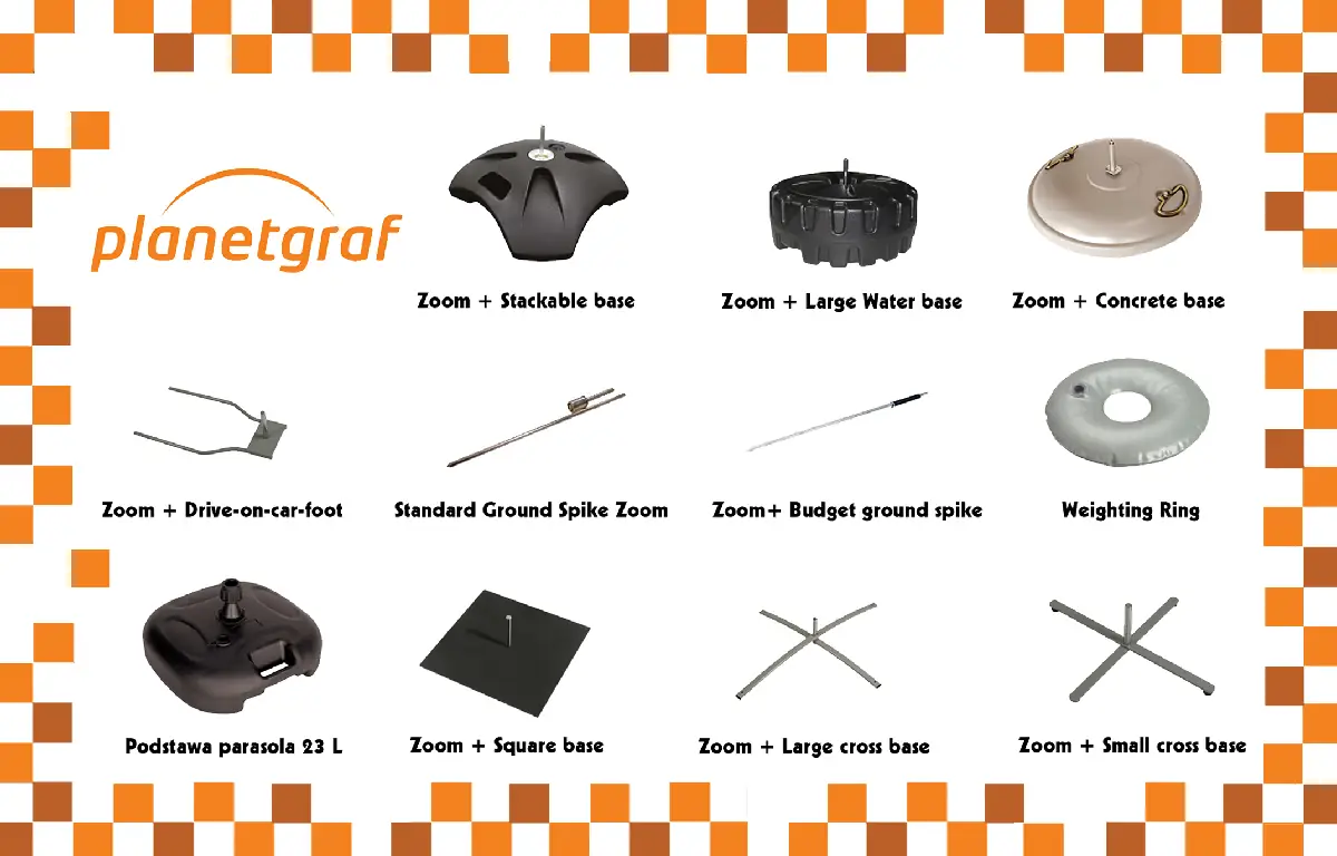 podstawy przenośne – krzyżaki, podstawy wodne, stalowe, śrubowe – dostosowane do różnych nawierzchni (beton, piasek, trawa),